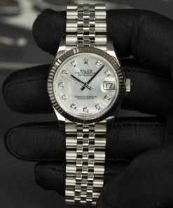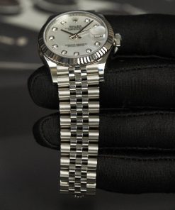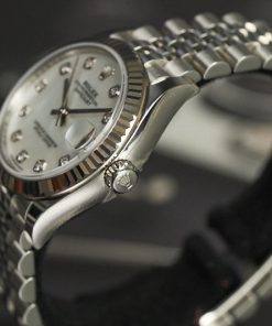 • Dial: mặt xà cừ trắng, kim, cọc số bằng vàng 18k, cọc số đính 10 viên kim cương tự nhiên