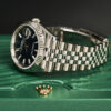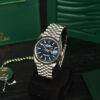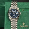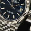 Đặc biệt, trên mặt số là các vạch chỉ giờ hình baguette trắng nằm gọn trên lớp nền xanh dương sâu thẳm cực kì tinh tế, cùng với đó là bộ kim chỉ giờ được chế tác từ vàng trắng càng làm tăng thêm sự sang trọng cho chiếc đồng hồ. Hơn nữa, mặt số còn sở hữu ô báo ngày tự động ở vị trí 3 giờ được phóng đại nhờ ống kính Cyclops đặc trưng của BST Datejust.