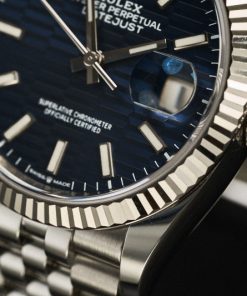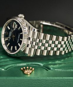 Đặc biệt, trên mặt số là các vạch chỉ giờ hình baguette trắng nằm gọn trên lớp nền xanh dương sâu thẳm cực kì tinh tế, cùng với đó là bộ kim chỉ giờ được chế tác từ vàng trắng càng làm tăng thêm sự sang trọng cho chiếc đồng hồ. Hơn nữa, mặt số còn sở hữu ô báo ngày tự động ở vị trí 3 giờ được phóng đại nhờ ống kính Cyclops đặc trưng của BST Datejust.