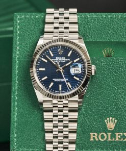 Đồng hồ Ro.lex Datejust 126234 được trang trí với họa tiết nếp gấp “Motif” màu xanh nước biển, sự tương phản giữa sắc sáng và tối ở mỗi chi tiết không chỉ mang lại vẻ đẹp đầy chiều sâu mà còn phản chiếu ánh sáng từ nhiều góc độ, tạo nên hiệu ứng thị giác độc đáo.