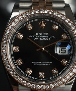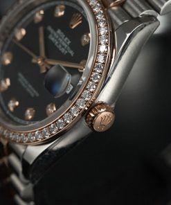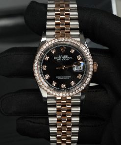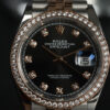 • Dial: mặt màu đen, kim, cọc số bằng vàng 18k, cọc số đính 10 viên kim cương tự nhiên