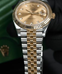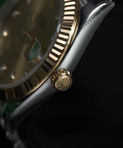 Nổi bật trên nền mặt số vàng champagne là những cọc số kim cương thiên nhiên lấp lánh. Bên cạnh góc 3h chính là ô cửa sổ hiển thị lịch ngày vô cùng tiện ích.