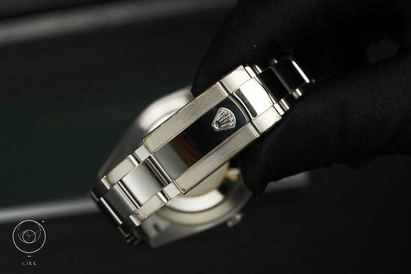 • Chất liệu vỏ: Thép Oystersteel kết hợp vàng trắng 18k