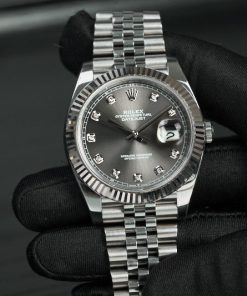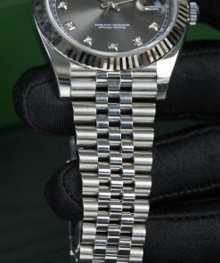 Mặt số màu xám với lớp hoàn thiện tia nắng tạo ra sự phản chiếu ánh sáng tinh tế được khuếch tán nhất quán dọc theo mỗi bản khắc, tạo ra ánh sáng tinh tế đặc trưng di chuyển tùy theo vị trí của cổ tay. Các điểm chỉ giờ nạm kim cương sáng nổi bật tạo nên một tổng thể hoàn hảo.