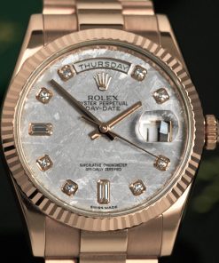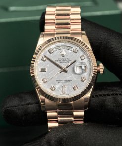 Điểm đặc biệt nhất ở DayDate 118235 là mặt số được làm từ đá thiên thạch Gibeon cực kỳ tinh xảo. Hiện nay, trên thế giới chỉ có duy nhất Rolex là thương hiệu được quyền chế tác đồng hồ từ loại thiên thạch này. Ngoài ra, các kim hiển thị giờ cũng được làm từ vàng hồng nguyên khối, cùng với đó là các cọc số kim cương vô cùng xa xỉ.