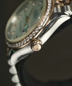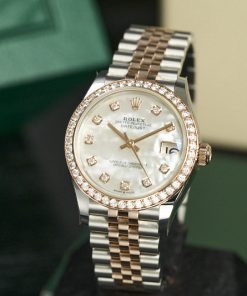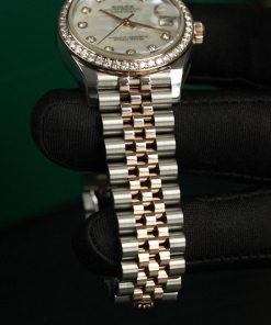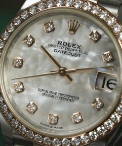 • Chất liệu vỏ: Thép Oystersteel kết hợp vàng hồng 18k, Vành bezel gắn 46 viên kim cương